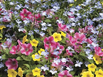 A delightful mixture of blooming annuals and foliage. Display on front porches or at entries for a dramatic burst of color in a variety of heights with trailing blooms of differing lengths.