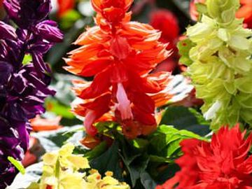A delightful mixture of blooming annuals and foliage. Display on front porches or at entries for a dramatic burst of color in a variety of heights with trailing blooms of differing lengths.